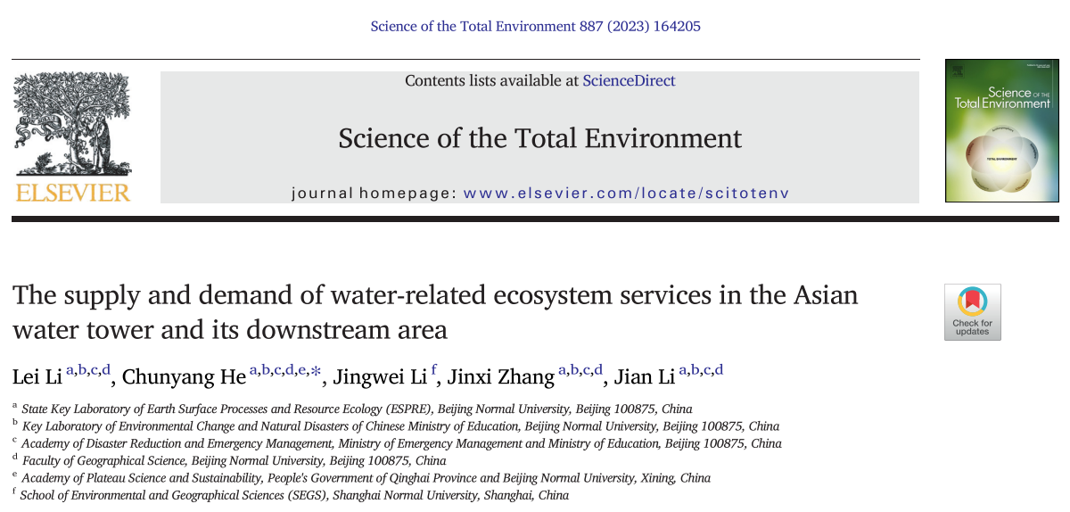 引用格式:Lei Li, Chunyang He, Jingwei Li, Jinxi Zhang, Jian Li. 2023. The supply and demand of water-related ecosystem services in the Asian water tower and its downstream area. Science of The Total Environment, 887, 164205. doi: 10.1016/j.scitotenv.2023.164205