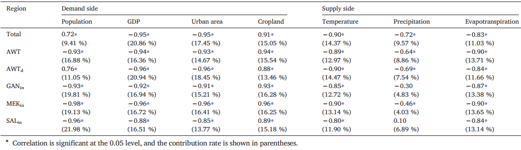 表1 各因子与生态系统涉水服务供需比的相关性和贡献率