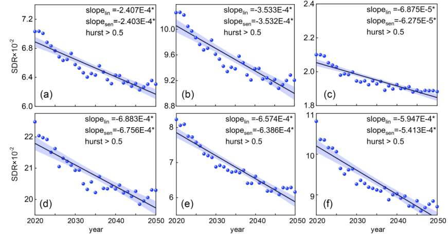 结果显示,2020-2050年生态系统涉水服务供需矛盾将持续加剧,供需矛盾加剧的面积为237.9万km2(61.7%),在所有情景供需比均为显著下降趋势(p<0.05<>),亚洲水塔内部的雅鲁藏布江-恒河流域、澜沧江流域和怒江流域是供需比下降速率最快的3个流域。