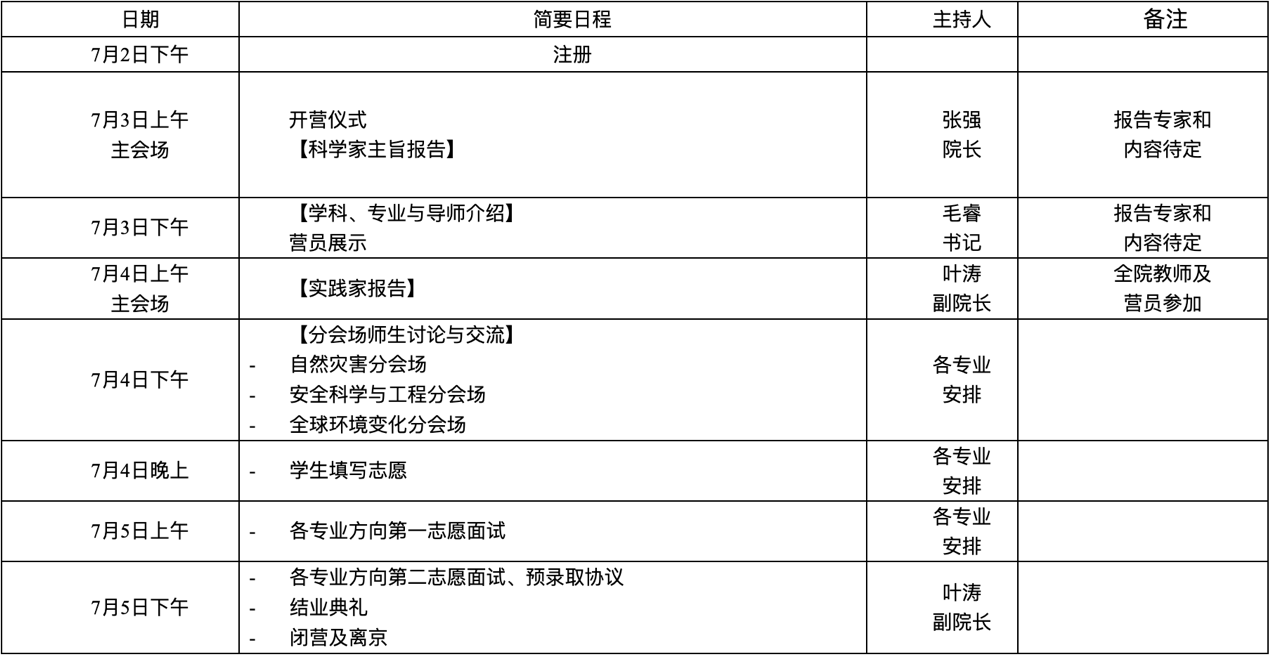 “自然灾害、公共安全与全球环境变化”暑期夏令营具体活动内容及日程安排请关注北京师范大学减灾与应急管理研究院网站(http://adrem.bnu.edu.cn/)的后续通知。