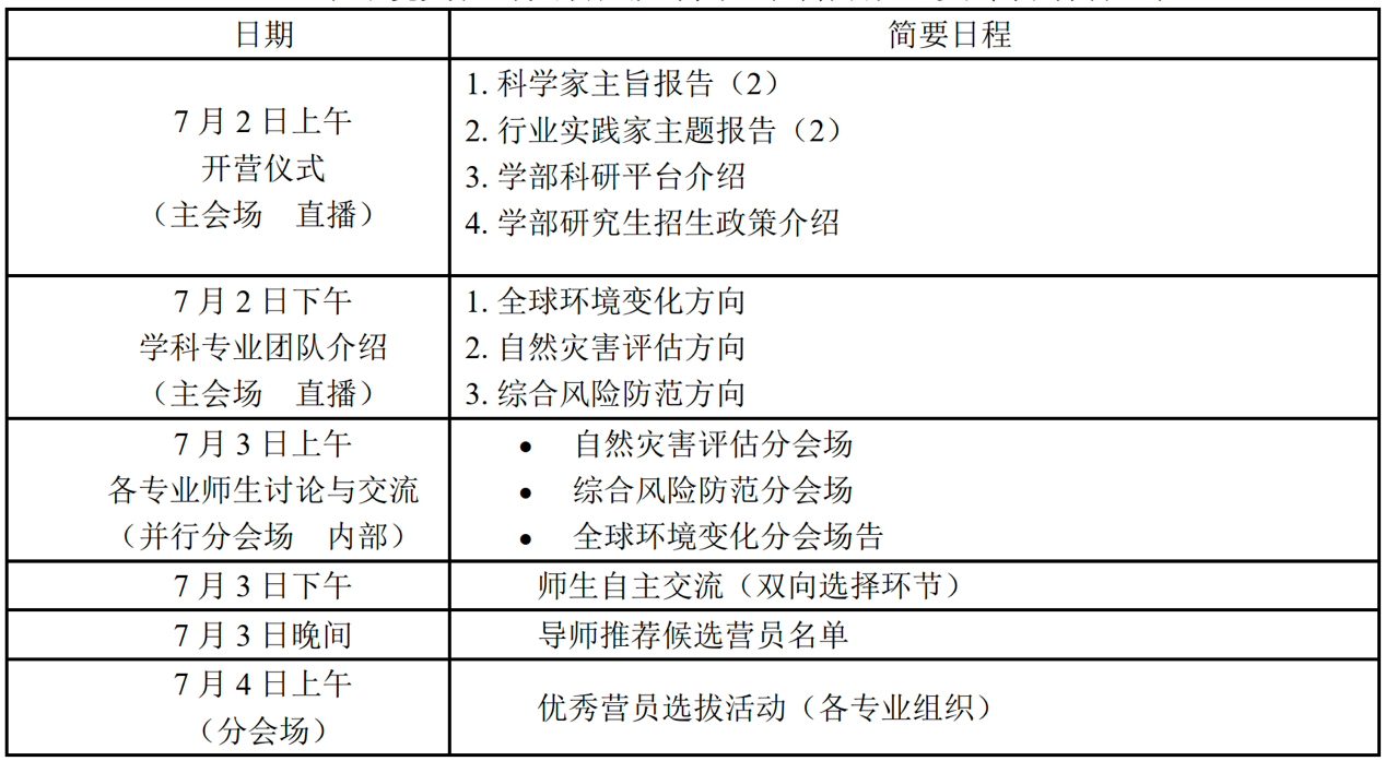 “全球环境变化与灾害风险科学”学科开放暨夏令营活动内容及日程安排请关注北京师范大学减灾与应急管理研究院网站(http:// adrem.bnu.edu.cn/)、地表过程与资源生态国家重点实验室网站(http://espre.bnu.edu.cn)及微信公众号的后续通知。
