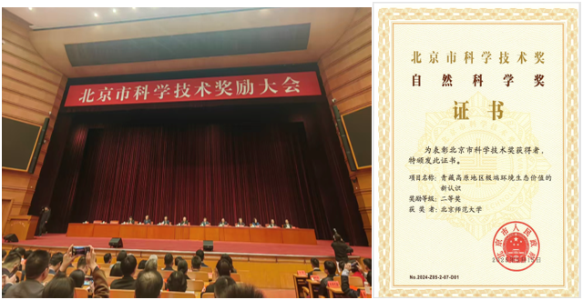 《青藏高原地区极端环境生态价值的新认识》荣获北京市科学技术奖自然科学二等奖,北京师范大学为该成果的唯一完成单位,北京师范大学地理科学学部史培军教授、于德永教授、周涛教授、朱文泉教授、唐海萍教授,以及博士研究生陈彦强、韩东妮、刘霞、姜楠为该成果的完成人。