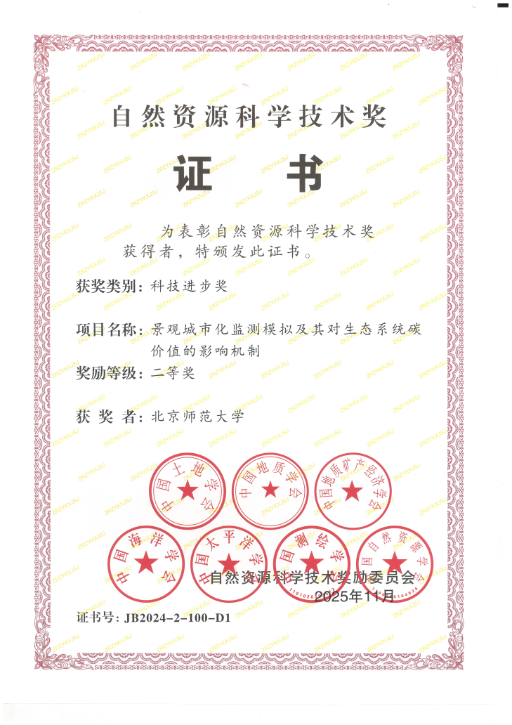 经公示和自然资源科学技术奖励委员会审定,“景观城市化监测模拟及其对生态系统碳价值的影响机制”荣获自然资源科学技术奖科技进步奖二等奖。该成果由北京师范大学与青海师范大学联合完成,何春阳教授、史培军教授、于德永教授、刘志锋副教授、姜璐副教授、王文颖教授、黄庆旭教授、陈克龙教授、周涛教授和毛旭锋教授为主要完成人。